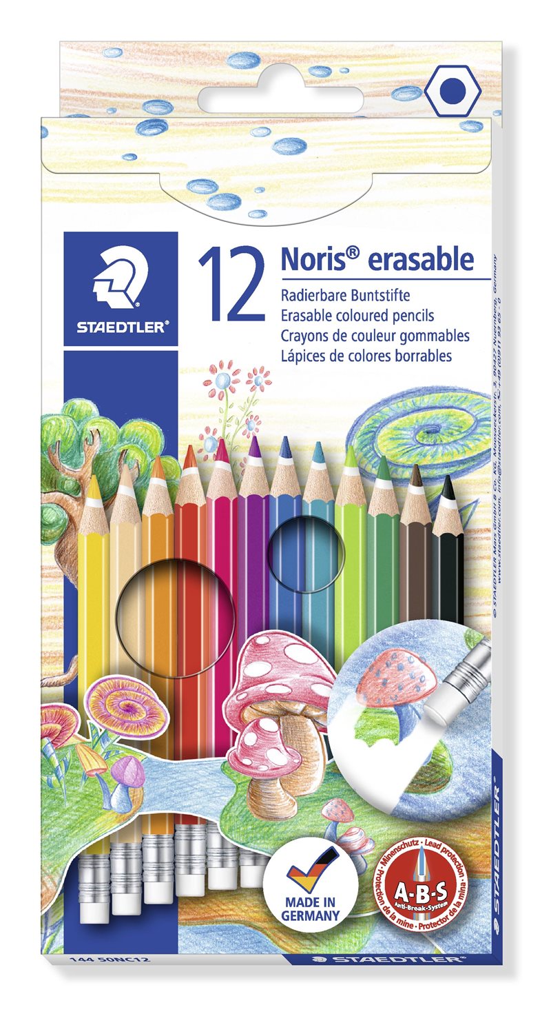 Noris Club® träfärgpenna • Pappask med 12 färgpennor • Sexkantig raderbar färgpenna av hög kvalitet för färgläggning • Mindre misstag kan korrigeras omgående med det PVC- och Latexfria suddgummit • A · B · S - den vita skyddande beläggningen förstärker färgstiftet och ökar brytmotståndet • Trä från PEFC -certifierat hållbart skogsbruk •