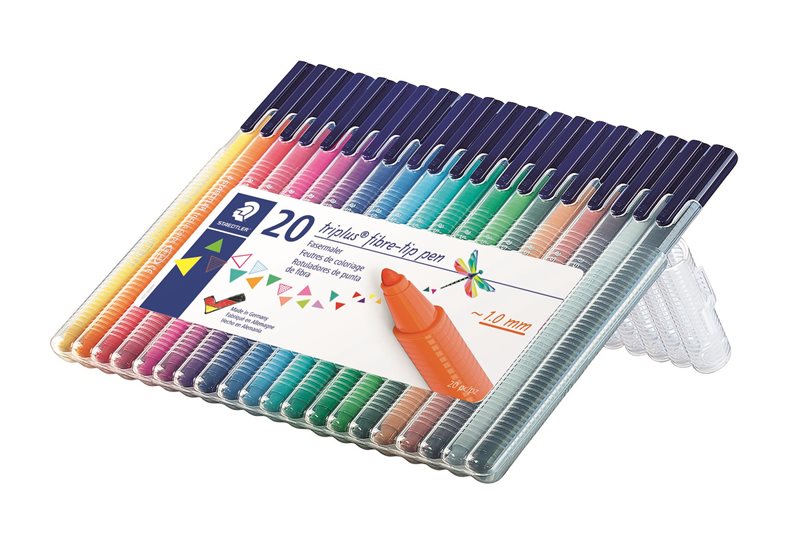triplus® color fiberpenna • Smart STAEDTLER-box i plast med 20 pennor • Stabila tryckbeständiga spetsar 1,0 mm • Fiberpennor i ergonomisk trekantig form för avslappnat och enkelt ritande och färgläggning • Ventilerad kork enligt ISO 11540 och BS 7272-1/2 • DRY SAFE-bläck, kan ligga utan kork i flera dagar utan att torka(enligt ISO 554, förutom neon-färgerna) • Vattenbaserad bläck - tvättas lätt av från de flesta textilier - Upp till 48 briljanta färger •